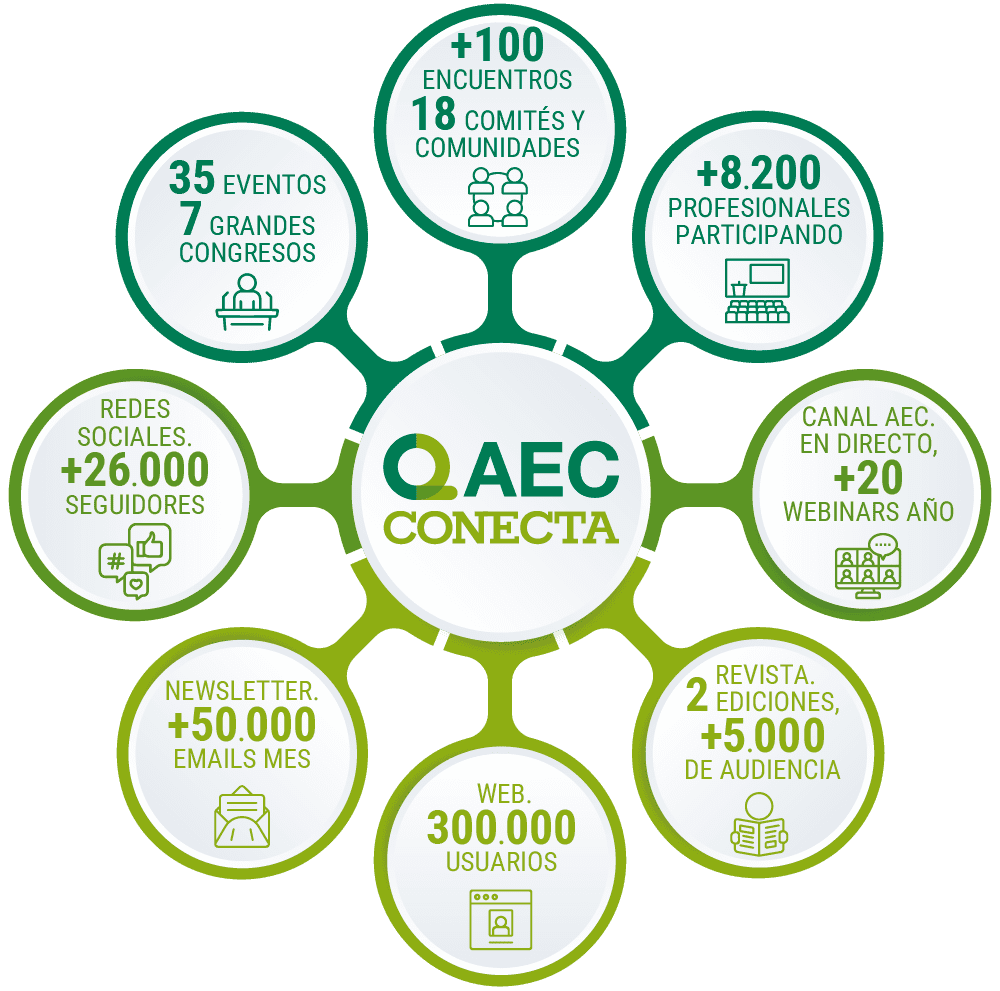 Presencia completa en todos los públicos, espacios y canales de la AEC. Disfrutarás de todas la ventajas de la plataforma AEC CONECTA. Impacto integral y significativo en las materias y disciplinas clave para impulsar la competitividad y los procesos de transformación de las organizaciones.