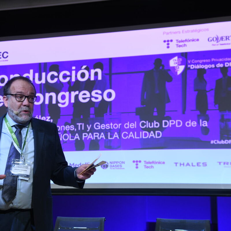El Club del DPD de la Asociación Española para la Calidad (AEC) celebró ayer 14 de diciembre el “V Congreso Privacidad “Diálogos DPD´s” en el Espacio Fundación Telefónica, Madrid. La cita, que contó con más de 100 asistentes presenciales y más de 500 visualizaciones online, estuvo a cargo de Alberto González, director de Operaciones, TI y Gestor del Club DPD de la AEC, que ejerció como conductor del encuentro que se ha convertido en un espacio de referencia para el sector.