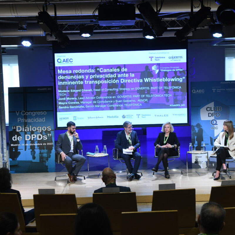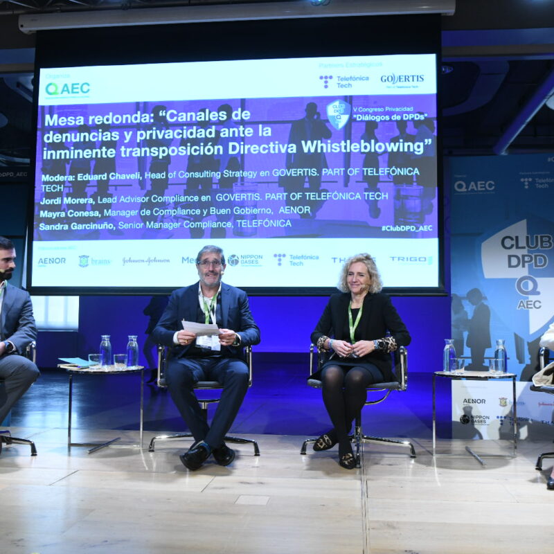 La primera mesa de debate estuvo a cargo de Eduard Chaveli, Head of Consulting Strategy en Govertis, que moderó un encuentro dedicado a abordar protección de datos, compliance y canal de denuncias. Analizando los antecedentes e implicaciones de la de la directiva europea en un encuentro titulado “Canales de denuncias y privacidad ante la inminente transposición Directiva Whistleblowing” que contó con la partipación de Jordi Morera, Lead Advisor Compliance, Govertis; Mayra Conesa, Manager de Compliance y Buen Gobierno, AENOR; y Sandra Garcinuño, Senior Manager Compliance, Telefónica.