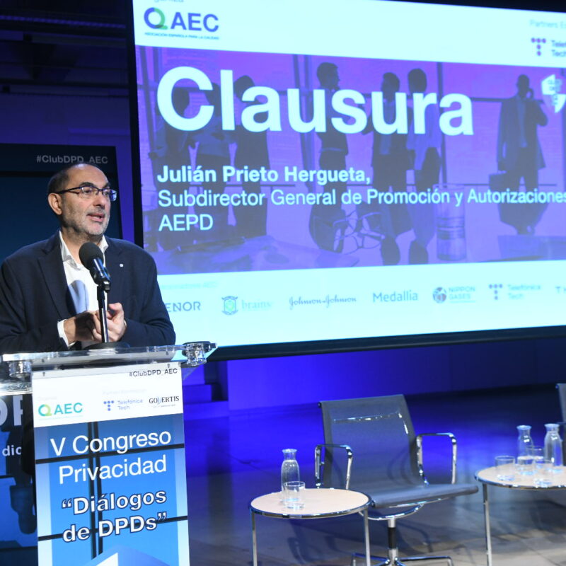 La clausura del “V Congreso Privacidad “Diálogos DPD´s” estuvo a cargo de Julián Prieto, subdirector de Promoción y Autorizaciones de la Agencia Española de Protección de Datos (AEPD) que en su intervención abordó la función del DPD como elemento clave para el cumplimiento de la normativa, y como garantía del derecho fundamental de la protección de datos.