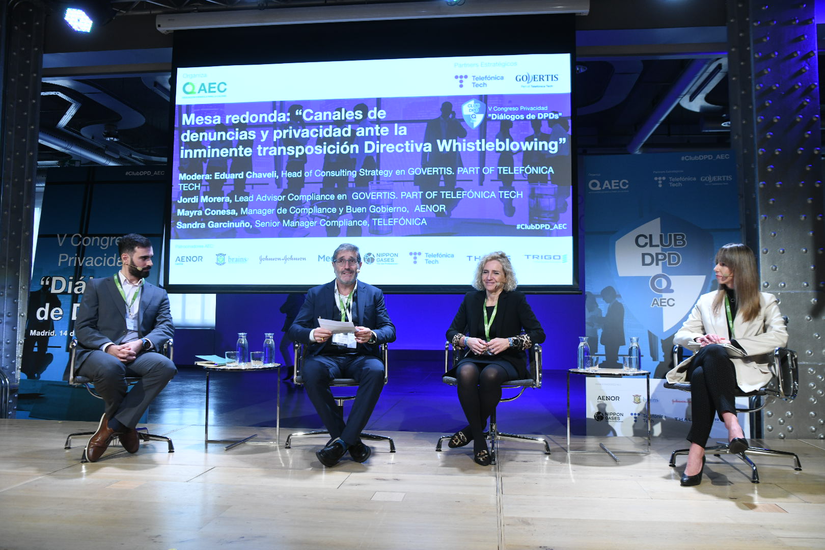 La primera mesa de debate estuvo a cargo de Eduard Chaveli, Head of Consulting Strategy en Govertis, que moderó un encuentro dedicado a abordar protección de datos, compliance y canal de denuncias. Analizando los antecedentes e implicaciones de la de la directiva europea en un encuentro titulado “Canales de denuncias y privacidad ante la inminente transposición Directiva Whistleblowing” que contó con la partipación de Jordi Morera, Lead Advisor Compliance, Govertis; Mayra Conesa, Manager de Compliance y Buen Gobierno, AENOR; y Sandra Garcinuño, Senior Manager Compliance, Telefónica.
