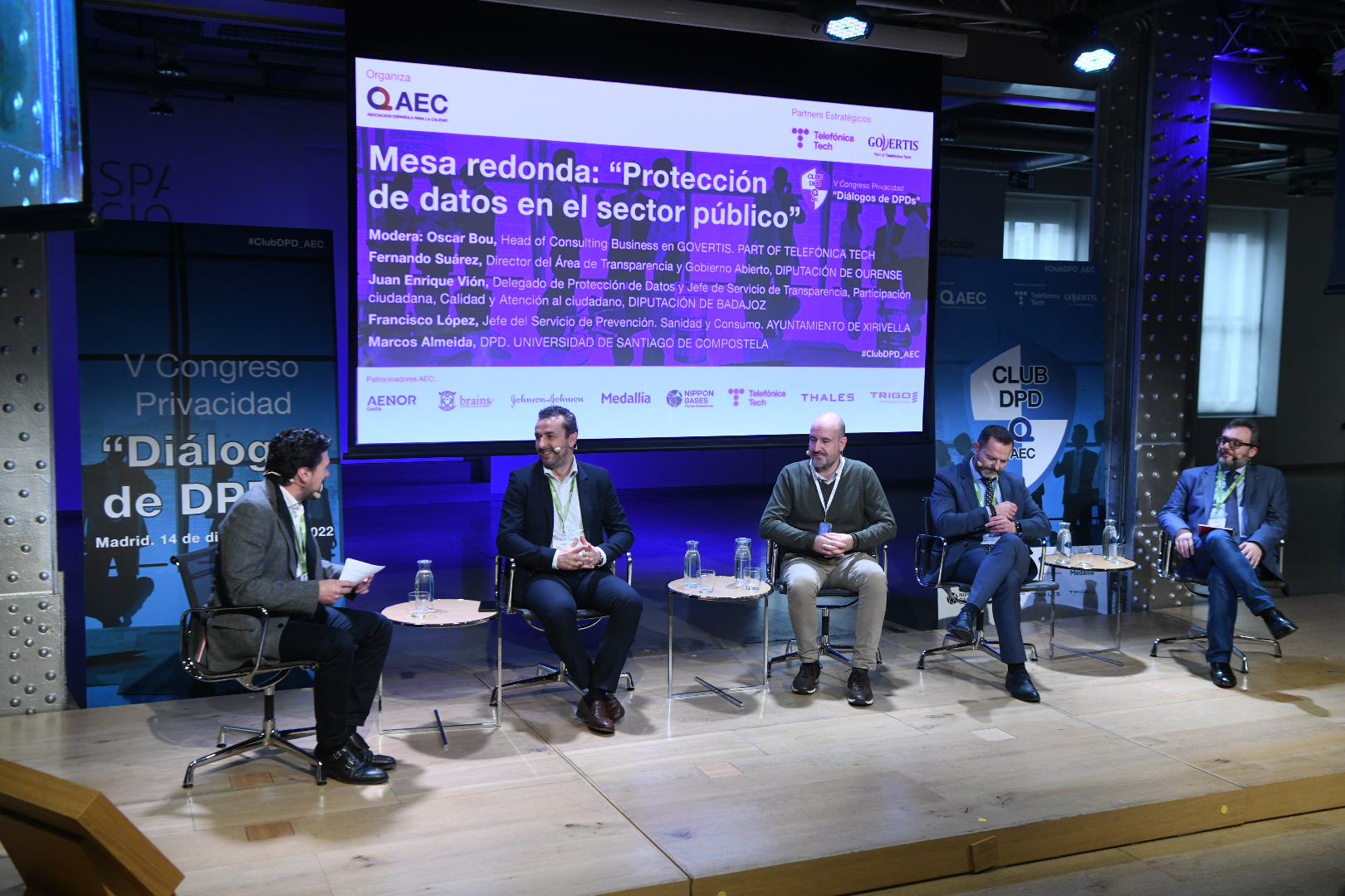 A mediodía, y tras un espacio para el networking, Oscar Bou, Head of Consulting Business en Govertis, moderó la mesa “Protección de datos en el sector público” que abordó, entre otros asuntos, el Esquema Nacional de Seguridad de la mano de Fernando Suárez, Director del Área de Transparencia y Gobierno Abierto de la Diputación de Ourense; Juan Enrique Vión, Delegado de Protección de Datos y Jefe de Servicio de Transparencia, Participación ciudadana, Calidad y Atención al ciudadano de la Diputación de Badajoz; Francisco López, Jefe del Servicio de Prevención Sanidad y Consumo del Ayuntamiento de Xirivella; y Marcos Almeida, DPD de la Universidad de Santiago de Compostela.