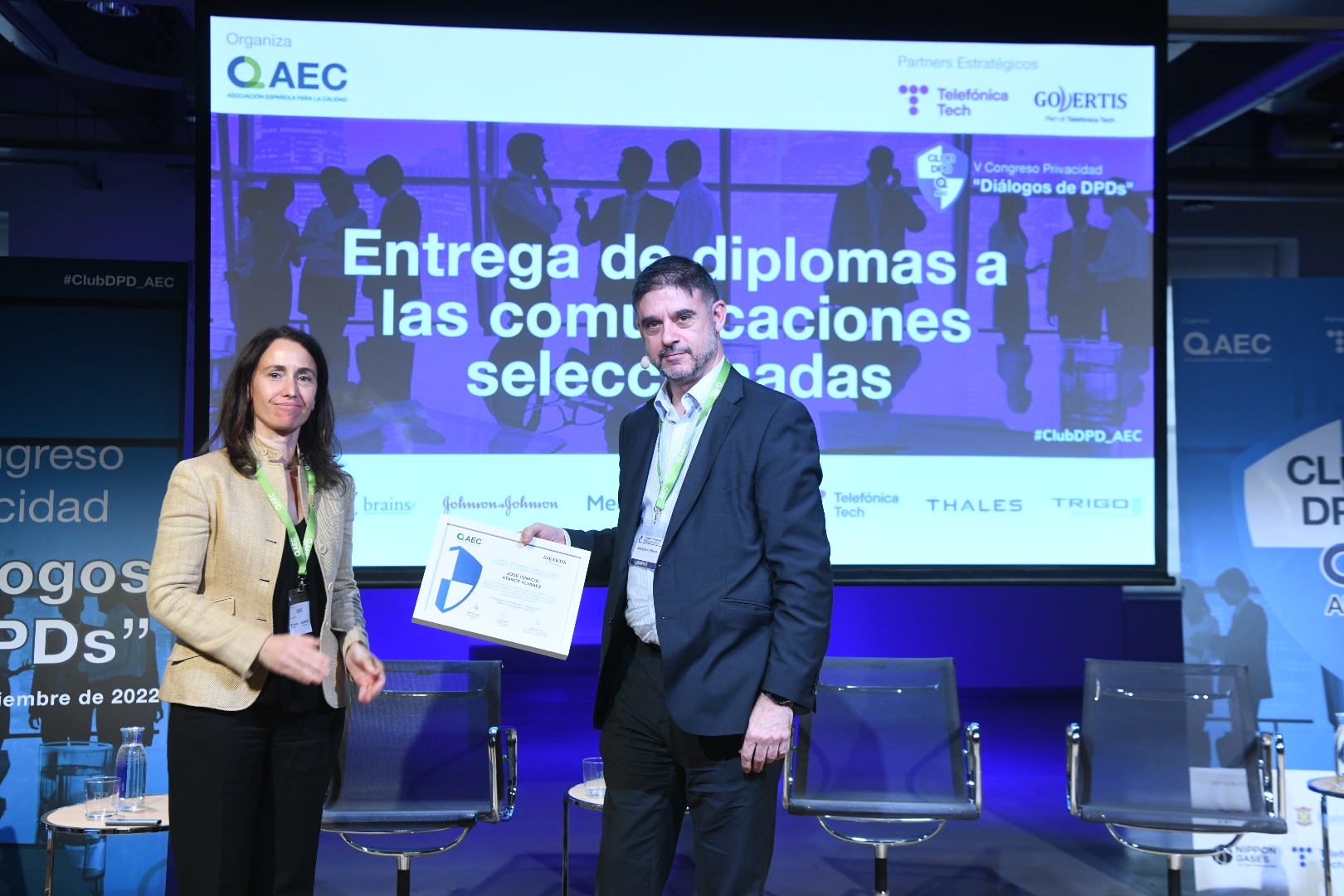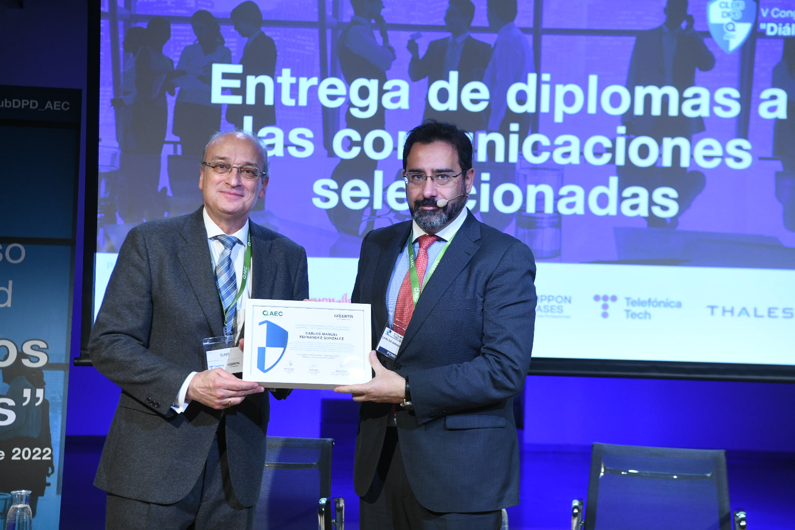 A continuación, fue el turno de participación de los dos ponentes seleccionados entre los interesados acudir como ponentes al “V Congreso Privacidad “Diálogos DPD´s”, Carlos Fernández, DPD de la Secretaría de Estado de Seguridad (Ministerio del Interior), que abordó «La relación entre de los DPD de las organizaciones y los de las autoridades competentes ante la aplicación de la normativa especial de tratamiento de datos personales con finalidad de prevención, detección e investigación de delitos»; y José Ignacio Atance, CEO de Acudata, que expuso su ponencia “Neurodatos: privacidad y riesgos del cerebro conectado”.