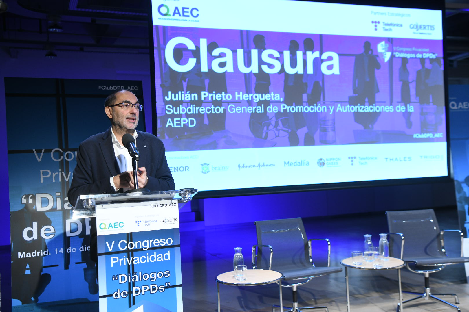 La clausura del “V Congreso Privacidad “Diálogos DPD´s” estuvo a cargo de Julián Prieto, subdirector de Promoción y Autorizaciones de la Agencia Española de Protección de Datos (AEPD) que en su intervención abordó la función del DPD como elemento clave para el cumplimiento de la normativa, y como garantía del derecho fundamental de la protección de datos.